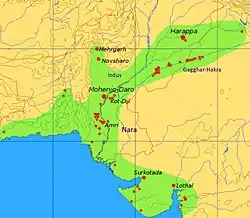 A large number of sites from the Mature Indus Valley Civilisation (2600-1900 BCE) are found along the middle course of the (dried-up) Hakra in Pakistan.[note 1] IVC-sites have not been found further south than the middle of Bahawalpur district, and it has been assumed that the Hakra ended there in a series of terminal lakes.