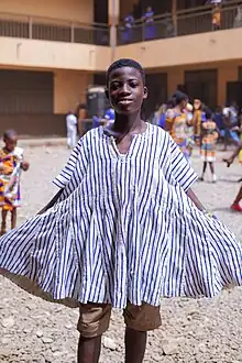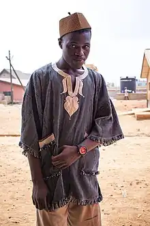 The smock is made of hand-loomed strips popularly called Strip Cloths.[3] They are made of a mixture of dyed and undyed cotton loom, and are originally from the northern part of Ghana and other parts of West Africa. The strips are sewn together by hand or machine giving the smock a plaid appearance. Most smocks have embroidery on the neckline. The smock is worn with a kufi cap. However, chiefs in Ghana wear the smock with a red fez hat.