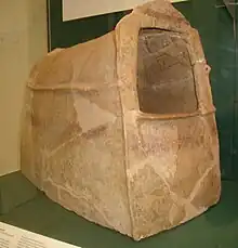 The Ghassulian stage was characterized by small hamlet settlements of mixed farming peoples, who had immigrated from the north and settled in the southern Levant - today's Jordan, Israel and Palestinian territories.[3] People of the Beersheba culture (a Ghassulian subculture) lived in underground dwellings, a unique phenomenon in the archaeological history of the region, or in trapezoidal houses of mud-brick. Those were often built partially underground (on top of collapsed underground dwellings) and were covered with remarkable polychrome wall paintings (one of the most notable examples being the 'Ghassulian Star').[3][6] Their pottery was highly elaborate, including footed bowls and horn-shaped drinking goblets,[3] indicating the cultivation of wine. Several samples display the use of sculptural decoration or of a reserved slip (a clay and water coating partially wiped away while still wet).[3] The Ghassulians were a Chalcolithic culture as they used stone tools but also smelted copper.[3][6] Funerary customs show evidence that they buried their dead in stone dolmens[7] and also practised secondary burial.[6]