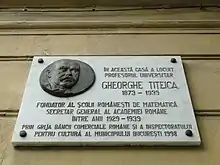 Țițeica married Florence Thierin (1882–1965) and the couple had three children — Radu (1905–1987), Gabriela (1907–1987), and Șerban (1908–1985) — all of whom pursued careers in academia;[10][11] the youngest one became a renowned quantum physicist. The family lived in a 19th-century house on Dionisie Lupu Street, close to Lahovari Plaza, in Sector 1 of Bucharest; Țițeica moved there around 1913, when he was elected to the academy.[11] A commemorative plaque was affixed to the house by the city administration in 1998. He died in 1939 in Bucharest[2] and was buried in the city's Bellu Cemetery.[12]
