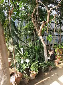 Today the garden contains about 300 species of useful tropical plants, primarily from Africa and the Americas. Plants are grouped according to use, with most in greenhouses but several dozen species growing outdoors. The collection includes sources of food (banana, cocoa, coconut, date, mango, papaya, pineapple, vanilla, and others), wood (mahogany, etc.), textiles (such as cotton), and dyes and perfumes.