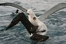 Similar in appearance to the wandering albatross, adult birds have white on the back, extending along the upper surface of the wings near the body. The white plumage of the head and body has fine grey barring. The upper wing has a black trailing edge, with black flight feathers and with mottled white patches on the black primary coverts. The underwing is white with a dark trailing edge. The tail is white with black edges, except in older males in which it may be completely white. The bill is pale pink. Females are slightly duller and smaller than males.[1] The taxon is generally paler than the nominate subspecies of Antipodean albatross, D. a. antipodensis, which breeds mainly in the Antipodes Islands.[6] Adult males have a mean weight of 6.8 kg and females of 5.8 kg.[7]