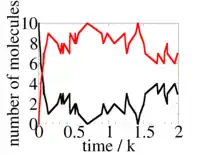 In probability theory, the Gillespie algorithm (or the Doob–Gillespie algorithm or Stochastic Simulation Algorithm, the SSA) generates a statistically correct trajectory (possible solution) of a stochastic equation system for which the reaction rates are known. It was created by Joseph L. Doob and others (circa 1945), presented by Dan Gillespie in 1976, and popularized in 1977 in a paper where he uses it to simulate chemical or biochemical systems of reactions efficiently and accurately using limited computational power (see stochastic simulation).[1] As computers have become faster, the algorithm has been used to simulate increasingly complex systems. The algorithm is particularly useful for simulating reactions within cells, where the number of reagents is low and keeping track of every single reaction is computationally feasible. Mathematically, it is a variant of a dynamic Monte Carlo method and similar to the kinetic Monte Carlo methods. It is used heavily in computational systems biology.