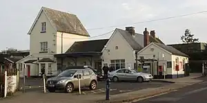 In 1923 the LSWR became part of the Southern Railway, which in turn was nationalised in 1948 to become the Southern Region of British Railways. A new signal box was opened on 28 April 1957, but on 5 April 1965 public goods services were withdrawn. Three years later a fertiliser distribution depot was opened in the old goods yard (it closed in 1993). The line had been transferred to the Western Region in 1963, and through trains beyond Exeter St Davids were soon diverted along other routes. The line was reduced to just a single track on 1 April 1967 with a passing loop retained at Gillingham.[1] Initially the single-track sections were 7-mile (11 km) westwards to Templecombe and 19-mile (31 km) eastwards to Wilton, but the latter was shortened to 9-mile (14 km)[2] in 1986.[1] The former signal box (now reduced to ground frame status following the 2012 resignalling) is at the west end of the station by the end of this platform.[2][3]