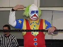 Initiated by English wrestler Les Kellett, wrestlers who fall under this category are Doink The Clown which was majorly portrayed by Matt Osborne until his death in 2013, which inspired others like Scottish comedian and actor Grado, Ring of Honor's Colt Cabana, Santino Marella, James Ellsworth, and Eugene's "mentally disabled boy" character, Japanese Wrestlers Stalker Ichikawa, Gran Naniwa, Kuishinbo Kamen and Toru Yano, Charlie Haas during his impersonations run, and WWE's 1990s turkey character Gobbledy Gooker, and rooster character Red Rooster, WCW's Brian Pillman, and Al Snow along with his mannequin prop called "Head" which he used as a sidekick companion during segments while addressing the fans. And recently, The New Day pursued a joyous gimmick, giving them a character heavily associated with the fans. Damien Sandow also falls under this category due to his 'stunt double' gimmick in late 2014 where he copied whatever his on-screen mentor The Miz did, due to the latter using a gimmick of an arrogant movie star. R-Truth also influenced his character with some of his comedic activities, such as breaking out a joke, dancing and finding out his opponent to win the 24/7 Championship in a strange and funny way.