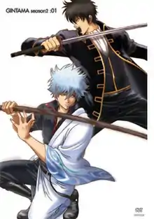 The second season of the Japanese anime television series Gin Tama are directed by Shinji Takamatsu and animated by Sunrise. They aired in TV Tokyo from April 5, 2007, until March 27, 2008, with a total of 50 episodes which are episodes 51–99 from the main series. The anime is based on Hideaki Sorachi's manga of the same name.[1][2][3] The story revolves around an eccentric samurai, Gintoki Sakata, his apprentice, Shinpachi Shimura, and a teenage alien girl named Kagura. All three are "free-lancers" who search for work in order to pay the monthly rent, which usually goes unpaid anyway.