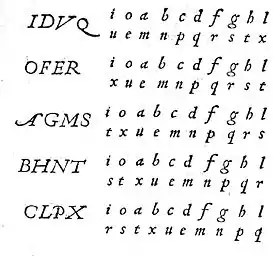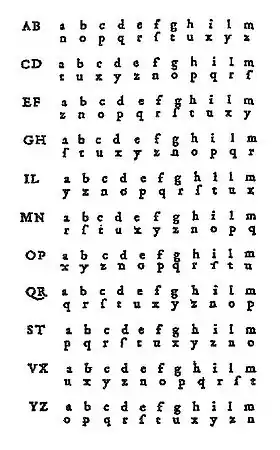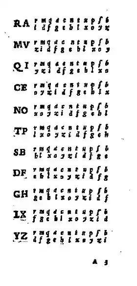 Bellaso's second booklet appeared in 1555 as a continuation of the first. The lower halves of the alphabets are now shifted regularly, but the alphabets and the index letters are mixed by means of a mnemonic key phrase, which can be different with each correspondent.