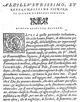 - Bellaso, Giovan Battista, La cifra del Sig. Giovan Battista Bel[l]aso, gentil’huomo bresciano, nuovamente da lui medesimo ridotta à grandissima brevità et perfettione, Venetia 1553.