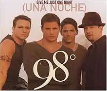 "Give Me Just One Night (Una Noche)" is a song by American boy band 98 Degrees, released as the first single from their third studio album, Revelation, on July 31, 2000. It was a success for the group, reaching number two on the US Billboard Hot 100 and on the Canadian RPM 100 Hit Tracks chart, becoming the band's highest-charting solo effort in both nations. The song was not as successful internationally but did reach the top 40 in Australia, Sweden, and the Netherlands. The single was certified gold by Recording Industry Association of America (RIAA) for shipments of 500,000 units.