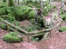 Glažuta is the site of two known mass graves from the period following the Second World War. Both graves contained the remains of prisoners of war murdered in June 1945. The Konfin Shaft 1 Mass Grave (Grobišče Brezno pri Konfinu 1) is located on the northern edge of a large sinkhole, below the forest railway and about 100 m from the road. It contained the bodies of about 88 Slovene, Croatian, and Serbian prisoners of war that were brought to the site on 24 June 1945 from the Yugoslav Secret Police central prison and murdered.[11] The Konfin Shaft 2 Mass Grave (Grobišče Brezno pri Konfinu 2) is located just south of the Konfin Shaft 1 Mass Grave, on the northern edge of another large sinkhole, about 150 meters (490 ft) from the Konfin Shaft. It contained the bodies of wounded Home Guard prisoners that were brought to the site on 22 and 24 June 1945 from the Yugoslav Secret Police central prison and from the St. Stanislaus Institute in Ljubljana and murdered.[12] The graves were excavated in 2006; after forensic procedures were completed,[13] the remains were buried at the cemetery in Prigorica in 2017.[14][15]