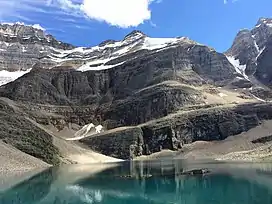 ![]() Glacier Peak (centered) with Mount Lefroy in upper left and Ringrose Peak in upper right as seen from Lake Oesa | |