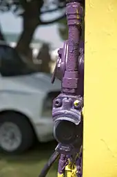 Gladhands are designed to allow the driver to disconnect without a mechanic or tools.[1] They sometimes utilize a quick release style to speed up brake release time.[1] A tractor / trailer typically has two gladhands - one for service brakes and another for emergency brakes.[3] Gladhands are color coded. In North America, service lines are blue and emergency brake lines are red and are standardized by SAE International's standard SAE J318.[4] Outside North America, the supply lines are red and the control lines are yellow, following International Organization for Standardization's standard ISO 1728.[5] The SAE "service" lines are synonymous with the ISO "control" lines and the "emergency" lines are synonymous with ISO "supply" lines.
