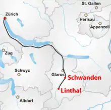 After leaving Zurich, the Glarner Sprinter ran along the west side of Lake Zürich, stopping only at Pfäffikon and Ziegelbrücke. From Ziegelbrücke it followed the valley of the Linth River, stopping at all intermediate stations including those for Glarus Town and Schwanden. On weekends and public holidays, the train then ran without stopping to Linthal; on other days it terminated at Schwanden.[2][3]