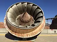 Construction continued and on September 13, 1963, the dam was topped out.[76] Work on the power plant and spillways began directly after the dam wall was complete. The spillway tunnels were excavated around both abutments of the dam, dropping steeply from their control gates on Lake Powell to merge with the lower ends of the diversion tunnels. This measure saved cost, but introduced a weak point where the two tunnels intersected. The upper ends of the diversion tunnels were then sealed with solid concrete. The first electricity was generated on September 4, 1964, with the power sent into the regional electric grid through a pair of long-distance transmission lines as far as Phoenix, Arizona and Farmington, New Mexico.[66] It took two more years to complete all remaining aspects of the project. On September 22, 1966 Lady Bird Johnson gave the official dedication speech for Glen Canyon Dam, before a crowd of 3,000 people.[79]