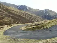 The A93 road, part of General Wade's military road from Perth to Fort George, runs north through the glen and on into Glen Beag, where it crosses the Cairnwell Pass, which at an elevation of 2,200 feet (670 metres) is the highest public road in the UK. The road climbing to the summit is now wide and straight but until the late 1960s included two notorious hair-pin bends with a 1 in 3 (33%) gradient known as the Devil's Elbow. One of the most spectacular roads in Scotland, this was a favourite subject for postcards. It was so steep that at the bottom buses unloaded passengers who had to walk to the top and until it was rebuilt the AA maintained a well in a layby for overheating engines. Locally the pass is still known simply as "the Elbow". At Dalrulzion, the B950 leads off to Strathardle and Kirkmichael village (4 miles) and at the Lair the B951 leads over into Glenisla. The long established caravan site at Dalrulzion is a favourite with weekenders from Dundee and Fife. Between Finegand and the Lair is the historic Cockstane (Clach Na Coileach), the ancient meeting place of the Clan MacThomas. There is a car park and information board with all the history. Current members of the Clan MacThomas from across the world gather here regularly.
