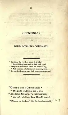 “Glenfinlas; or, Lord Ronald's Coronach” by Walter Scott, written in 1798 and first published in 1800, was, as Scott remembered it, his first original poem as opposed to translations from the German.[1] A short narrative of 264 lines, it tells a supernatural story based on a Highland legend. Though highly appreciated by many 19th century readers and critics it is now overshadowed by his later and longer poems.