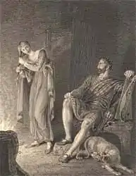 Moy replies that his heart is too low-spirited for such things, that he has had a vision of the sisters’ shipwreck, and a presentiment that Ronald himself will die. Ronald mocks Moy's gloomy thoughts and goes off to keep a tryst with Mary in a nearby dell, alone except for his hounds. Presently the hounds return without Ronald. Night falls, and at midnight a huntress appears, dressed in water-soaked green clothes and with wet hair. She begins to dry herself before the fire, and asks Moy if he has seen Ronald. She last saw him, she says, wandering with another green-clad woman. Moy is afraid to go out into the ghost-haunted darkness to look for them, but the woman tries to shame him out, and shows that she knows more of Moy than he realizes: