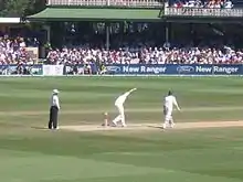 McGrath's bowling was not of express pace. Rather, he relied on unerring accuracy and subtle seam movement, which he derived from his high wrist action and lengthy follow-through.[23][24] His height (195 cm), combined with a high arm action, allowed him to extract extra bounce, which often surprised batsmen. In the later years of his career he developed as a swing bowler.[25]