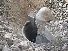 To minimise visual impact from the coast the quarry is sited 1 mi (1.6 km) inland, and cut down into the mountain 1,600 ft (500 m) above sea level. Each explosive blast dislodges about 70,000 tons of granite, which is transported by dump truck to the primary crusher, which reduces it to lumps no bigger than nine inches in diameter.[2] It is then transferred by conveyor belt to a heap that covers the "glory hole", a 1,000 ft (300 m) vertical shaft 10 ft (3 m) in diameter, which is permanently full of rocks. At the base of the glory hole, deep inside the mountain, rocks are transferred to a horizontal conveyor and moved through a 1-mile-long (1.6 km) tunnel to the second crusher on the shore, where oceangoing ships are loaded in the deep-water docks at the rate of 6,000 tons per hour.[2]