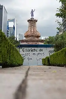 On 12 October 2021, the city government announced that it intended to replace the monument to Columbus with a replica of The Young Woman of Amajac.[31] Three days later, feminist groups urged the authorities to not remove the piece unless the roundabout is formally renamed the Glorieta de las mujeres que luchan. They also criticized that the artwork that is expected to replace theirs is believed to have been a young elite woman or a ruler.[32] The mother of a murdered teenager said that any alteration would be "an act of direct aggression to the demands of justice".[24] Sheinbaum stated in June 2022 that the replica of The Young Woman of Amajac was almost complete and that she was in talks with feminist collectives to reach an agreement on the relocation of the main sculpture.[33] In response, feminist groups stated that no such talks had taken place as of August 2022 and claimed that the government was only interested in advancing its political agenda, adding that "the state wants to hide the fact that 11 to 13 women are murdered each day [and] that more than 30 people disappear each day".[34]