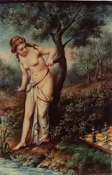 - A type of decoy involving a sacrifice of a minor or major piece on a square next to the enemy king, forcing the king to abandon the defense of another square. For example (see diagram), the black queen has interposed to block a check from the white queen, and White can check the king from the opposite direction to win the queen.[21]