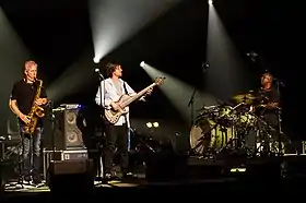 As this photo shows, popular music genre bands use acoustic instruments (such as sax and drums) and electric instruments (such as electric bass), all of which are amplified through a PA system of speakers. Pictured are the Yellowjackets, a jazz-rock fusion band.