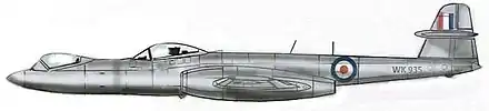 Following some 55 hours of flight testing over 99 flights, the results were inconclusive; although the prone position concept was feasible, the development of special aviation clothing (g-suits) offered a simpler solution to the problem of counteracting inertial forces, and the prone position Meteor was no longer needed. Although prone pilots were able to control the aircraft as well as a standard Meteor, the extreme forward position with limited rear view presented a problem in mock combat with conventional aircraft.[2] RAF test pilot C.M. Lambert described flying Meteor WK935 in the 30 March 1956 issue of Flight magazine.[3]