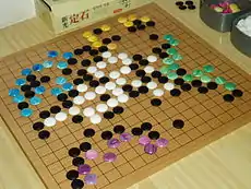 In Multi-player Go, stones of different colors are used so that three or more players can play together. The rules must be somewhat altered to create balance in power, as those who play first (especially the first four, on a four-cornered board) have significant advantage.[12]