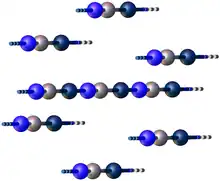 Gold(I) cyanide's is a coordination polymer consisting of linear chains of AuCN such that each Au(I) center is bonded to carbon and nitrogen. The structure is hexagonal with the lattice parameters a = 3.40 Å and c = 5.09 Å.[2] T[6]