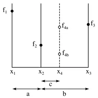The diagram above illustrates a single step in the technique for finding a minimum. The functional values of are on the vertical axis, and the horizontal axis is the x parameter. The value of has already been evaluated at the three points: , , and . Since is smaller than either or , it is clear that a minimum lies inside the interval from to .