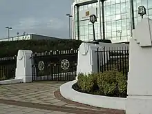 - The Firestone Tyre Company. Built 1928, designed by Wallis, Gilbert and Partners.[3][4] It was the first overseas factory built by the Firestone company of America. The building frontage was demolished during a public holiday in August 1980 shortly before a preservation order was due to be served on it to retain the Art Deco architecture.[5][6] The Art Deco gatehouse was demolished in 2004 to make way for increased parking facilities. The remaining gates, railings, and piers are in a Jazz Modern style and are Grade II listed.[4]