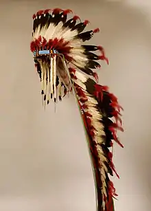 Feathers are often worn on Native American headdresses and have been compared to the Bible and cross of Christianity. Some nations use eagle feathers in the construction of prayer sticks, doctors’ rattles and sacred medicine pipes. Per Thomas E. Mails: "in the mind of the Plains warrior in the 18th and 19th century, the male golden eagle flew above all the creatures of the world and saw everything. Nothing matched his courage and swiftness, and his talons had the strength of a giant's hand. The eagle was very holy."[29] The tail feathers of juvenile golden eagles are used in some ceremonies as well as to honor noteworthy achievements and qualities such as exceptional leadership and bravery.[29] several Sioux communities have an “eagle dance”, where the dancers imitate the motions of a flying eagle, accompanied by a traditional song for the eagles. Historically, plains warriors have not been allowed to use weapons when capturing eagles for their feathers. The most common method to capture golden eagles is to lay a trap, consisting of an earth-colored tarp, with a dead jackrabbit on it, over a pit containing a crouching warrior. When the eagle comes to land on the tarp, the warrior grabs the eagle by the top of its feet to pull it in and kill it. The hunter may simply take some feathers and let the bird go free. If the warrior fails to grab the eagle properly it sometimes results in serious injury to the human.[29] Among the Hopi people, one of two eagle nestlings (it is strictly forbidden to capture one unless there are two nestlings in the nest) may be captured and raised with great care, until it reaches an age where feathers can be taken.[30]