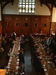 Gonville and Caius College maintains many traditions. It offers two seatings in Hall three nights a week. Typically attended by between 150–200 students, Hall consists of a three-course meal served after 18:00 (First Hall) or 19:15 (Formal Hall); Formal Hall requires a gown be worn, and seats Fellows at its high table. It is preceded by the benediction, which is said in Latin: