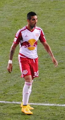 On 4 August 2015, it was reported that Verón officially signed with the New York Red Bulls, with the MLS side paying a transfer fee of $2.2 million to San Lorenzo.[17] Five days later, he made his debut for New York, appearing as a late match substitute in a 2–0 derby victory over New York City FC.[18] On 15 August 2015, he scored his first goal for New York in a 3–0 victory over Toronto FC.[19] Although being used primarily as a substitute during his first season; his speed and versatility off the bench helped play a strong role in New York winning their second Supporters' Shield.[20]