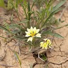 Goodenia lunata, commonly known as stiff goodenia,[2] is a species of flowering plant in the family Goodeniaceae and is endemic to inland Australia. It is a ascending or low-lying herb with linear to egg-shaped leaves, small racemes of yellow flowers, and more or less spherical fruit.