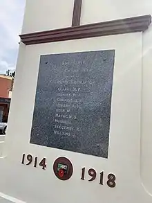 On each of the other faces are polished granite plaques with the engraved names of those who made the Supreme Sacrifice (died). The southern face bears the names of the nine who fell in the First World War and the dates 1914 – 1919. The western face displays the names of the twelve who fell in the Second World War, and the eastern face is blank. Above the base is the body of the tower which is plain except for a simple central decorative element, painted dark brown. The uppermost section of the body has stop-chamfers to each corner which continue into the clock section.[1]