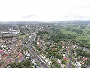 Goonellabah from the air, showing the Bruxner Highway into Lismore, and Goonellabah Shopping Centre in the distance