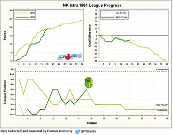 Comparing Tomić's 15 league games in charge with the same time period prior to his arrival shows marked progress. Prior to his arrival, Istra 1961 had an average goal difference of -1.54 per game, picking up an average of 0.26 points per game. Contrasting this under Tomić's leadership, the average goal difference improved to -0.14 (+1.40) and the points per game increased to 1.20 (+0.94).