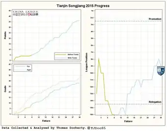Tianjin continued to push up the table but with the need to blood young Chinese talent ready for the 2016 season, the absence of its foreign aid stalled the charge, Tianjin ended the 2015 season in a very respectful ninth position and were notably the only side to beat eventual runaway champions Yanbian in their own backyard.