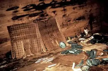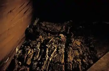 At the north of the chamber was the king’s “bed,” which has now been identified as an open log coffin, carved from a huge cedar log, with ledges extending out at both ends. Four large pine blocks had braced the coffin body, and inlaid rails were socketed into the sides. This new information led to a fuller understanding of the circumstances of the king’s burial. The remains of the coffin, as disposed on the tomb floor, showed that a funeral ceremony had taken place before the interment: the coffin had clearly been assembled elsewhere before the burial, then disassembled, and its parts placed in the chamber in something other than their original positions.[15]
