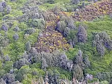 A patch of gorse surrounded by regenerating native bush at Hinewai Reserve on Banks Peninsula.