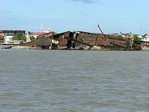 On 10 May 1940, Germany invaded the Netherlands, and the police were ordered to intern all Germans in the colony. The crew of Goslar did not want the ship to be confiscated, therefore, they moved the coal to one side, and blew a hole in the ship's bottom, causing Goslar to sink.[1] The crew was arrested, and were briefly interned at Fort Zeelandia in Paramaribo, before being sent to the Copieweg internment camp where they spent the rest of the war.[6][7][5] By 11 May, the ship was on her side, however she caused no obstruction to the river traffic.[8] On 15 May, Nicolaas van Beek, the police commissioner in charge, was suspended.[8] In 1944, the freighter Juno carrying bauxite collided with Goslar.[2]