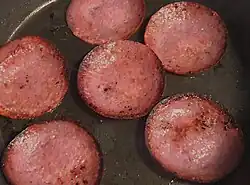 Goteborg sausages, named after the second largest city in Sweden, is a type of summer sausage of beef and pork. Being a cured, dried, and smoked sausage, cooking it is not necessary, and like other summer sausages, it historically could be kept without refrigeration.[6] This was especially desirable during periods of high temperatures where fresh meats would otherwise spoil and where refrigeration was not available.[6] Most Goteborg sausages sold in Hawaii today are made by Hormel, the same makers of the popular SPAM.[7][8][9]