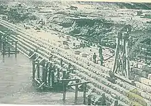 The construction of the weir began with the construction of six tunnels designed to pass the normal river flow. These would allow the construction of the masonry section of the weir to proceed with the river flows passing through the tunnels underneath. The tunnels were fitted with sluice gates that could be closed once the weir was completed allowing structure to raise the height of the river upstream.