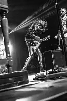 On guitars, Potter primarily plays the Gibson Flying V; however, she also plays classical guitars with nylon strings.[5] On keys, she plays the Hammond organ.[28] Her voice has been described as soulful and bluesy and she has been compared to Bonnie Raitt and Janis Joplin.[29] She has also been described as a "grittier Patty Griffin".[28]
