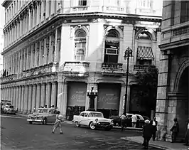 The building on a plot bounded by Calles Neptuno, San Rafael, Monserrate y Zulueta was designed by the architect Don Pedro Tomé y Veracruisse, construction began in 1890. While the building was still unfinished, Don Julián de Zuluetawas sold it to Andrés Gómez Mena who came to Cuba from Spain and completed the first floor. Designed around interior passageways that ensured natural light and ventilation, four floors were added from 1916 to 1918. The ground floor was surrounded on all four sides by covered galleries, the inner passageways of two interior diagonal streets, forming an 'X' on the plan, were integrated with the exterior galleries. The upper floors contained law firms and business offices. Gomez built two theaters, the Politeama Grande and the Politeama Pequeño, which had a short-existence.[4] Andrés Gómez Mena was shot to death in Havana, on January 11, 1917, by the Catalan watchmaker Fernando Reugart, who argued that Gómez Mena had disrespected his wife.[5] Since its early days in 1832, the most popular commercial stores were directly located on the streets of Calles Muralla and Oficios, along with other arteries, such as Monte, Neptuno, San Rafael, and Galiano. The building until 1918 occupied one floor with covered galleries, four levels were eventually added, eight elevators to facilitate access to those floors. It had 560 offices, the Pitman commercial academies were located on the second level, and for students seeking to prepare in shorthand and typing methods. There was the Ibero-American Institution of Culture chaired by the Cuban scholar Fernando Ortiz, as well as consular and diplomatic agencies. The Manzana de Gomez at one point held over 500 offices. It was estimated that 25,000 people visited daily.[6]