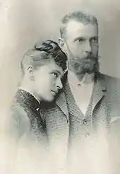 In 1881 there had been talks of a possible marriage to Princess Caroline Mathilde of Schleswig-Holstein.[18] Emperor Alexander II had hoped that at least one of his sons would marry a princess of Hesse as he had done. Sergei eventually chose as his bride Princess Elizabeth of Hesse, a daughter of Ludwig IV, Grand Duke of Hesse and by Rhine and Princess Alice of the United Kingdom. She was an older sister of both Ernst Ludwig, Grand Duke of Hesse and by Rhine and Alix of Hesse, later the Empress consort of Nicholas II of Russia and a niece of Prince Alfred, Duke of Edinburgh, who married his older sister Grand Duchess Maria Alexandrovna of Russia. They were first cousins once removed (i.e., Elizabeth's great-grandfather, her father's paternal grandfather, Louis II, Grand Duke of Hesse, was Sergei's maternal grandfather) and had known each other all their lives.[3] There were hesitations on both sides and Elizabeth first rejected his proposal of marriage.[18] Queen Victoria, who had anti-Russian sentiments, opposed the marriage of her motherless granddaughter.[19] Elizabeth and her sisters were not pressured into following political marriages; they were allowed to follow their own inclination.[18] After the couple spent some time together at Schloss Wolfsgarten in Darmstadt in September 1883, Elizabeth agreed to marry him.[20] Their engagement was announced publicly on 26 February 1884 when Sergei returned to visit her in Darmstadt.[21] Upon her marriage, Princess Elizabeth took the name of Grand Duchess Elizabeth Feodorovna of Russia.[22] The wedding took place on 15 June 1884 in the Winter Palace.[23]