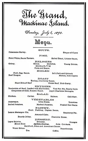Mackinac Island National Park became the second National Park in the United States in 1875 (before becoming a Michigan State park in 1895). This led to a large increase in visitors to the island.[8] In 1886, the Michigan Central Railroad, Grand Rapids and Indiana Railroad, and Detroit and Cleveland Steamship Navigation Company formed the Mackinac Island Hotel Company. The group purchased the land on which the hotel was built and construction began, based upon the design by Detroit architects Mason and Rice. When it opened the following year, the hotel was advertised to Chicago, Erie, Montreal and Detroit residents as a summer retreat for vacationers who arrived by lake steamer and by rail from across the continent. The hotel opened on July 10, 1887, after taking a mere 93 days to complete. At its opening, nightly rates at the hotel ranged from $3 to $5 a night (equivalent to $97.71–162.85 in 2022).[9][10]