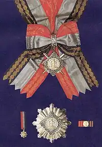 ![]() Grand Order of King Petar Krešimir IV (top: Grand Order medal with sash; bottom: Morning Star (Danica) medal; left: smaller decorative version; right: Grand Order ribbon) | |