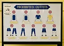 Inside the main hall (throne room), situated at the very centre of the Chakri Maha Prasat Hall, is the Bhudthan Thom Throne (พระที่นั่งพุดตานถม; RTGS: Phuttan Thom), a chair on a raised platform. The Throne is flanked by two seven-tiered umbrellas, while the throne itself is topped by a Royal Nine-Tiered Umbrella. Behind the throne is a tapestry depicting a fiery intertwined chakra and trishula or the 'Chakri', the emblem of the dynasty. The throne has been used by the king during important state occasions, such as the welcoming or accrediting of foreign diplomats and missions. The room itself has also been used by King Rama IX to welcome foreign dignitaries and heads of state, such as Queen Elizabeth II, President Bill Clinton and Pope John Paul II.[72] Recently the King welcomed over 21 world leaders inside the room during the Asia-Pacific Economic Cooperation (APEC Summit) held in Bangkok in 2003.[70] The wall of the throne room is decorated with four paintings, depicting important scenes in the history of Thai foreign relations. On the east wall hang two paintings called 'Queen Victoria receiving King Mongkut's Ambassador' and 'King Louis XIV receiving the Ambassador of King Narai of Ayutthaya in the Hall of Mirrors at Versailles'. On the west hangs 'King Mongkut receiving British Envoy Sir John Bowring' and 'Napoleon III receiving the Siamese Ambassadors at Fontainbleau'.[73][74]